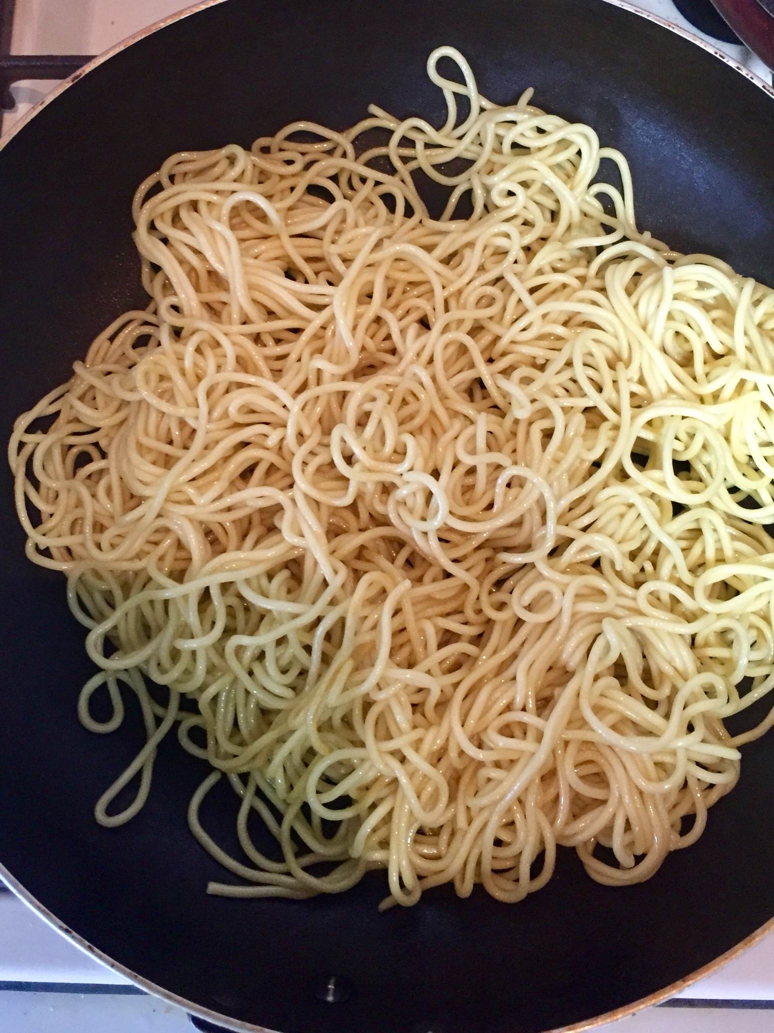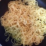 白菜は横幅1、5㎝にそぎ切り、あとの野菜も食べやすい大きさに切る。 - フッ素樹脂加工のフライパンにごま油大さじ1をひいて中火で熱し麺を入れます。(鉄製の場合は油を多めに)箸で麺をほぐし、その後は触らずじっくりと両面香ばしく焼きます。