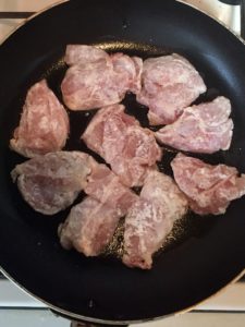 塩小さじ4分の1をもみこみ、小麦粉大さじ1をまぶしておく。 - フライパンにごま油大さじ1を熱し、鶏胸肉をこんがりと焼く。