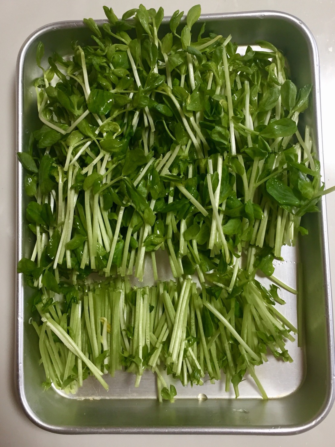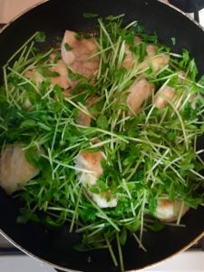 - 豆苗(長さ3等分に切り分けたもの)を手早く炒める。